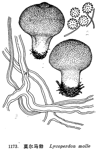 子实体较小,近梨形,或近陀螺形,直径2-5(6)cm,高2.5-6(7)cm,幼时灰褐色,后变浅土黄褐色,表面有剌疣,每个剌疣由数个小疣组成呈锥剌状,老后部分可脱落。不育柄部比较发达,但较短,长1-2cm,粗0.5-1cm,较顶部色浅,基部污白,具小疣剌,孢粉初期白色,后呈青褐色粉未。当成熟时,顶部中央破裂,孢子散出。孢子球形,具明显的剌状小突起,浅褐色,孢子小柄无色,长10-20μm,往往脱落。孢丝粗,厚壁,细长,褐色,粗1.5-5.5μm。图例