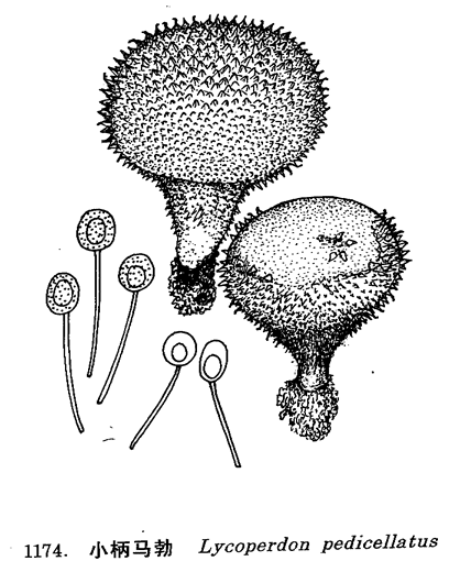图 1174 小柄马勃 : 1. 子实体, 2. 孢子