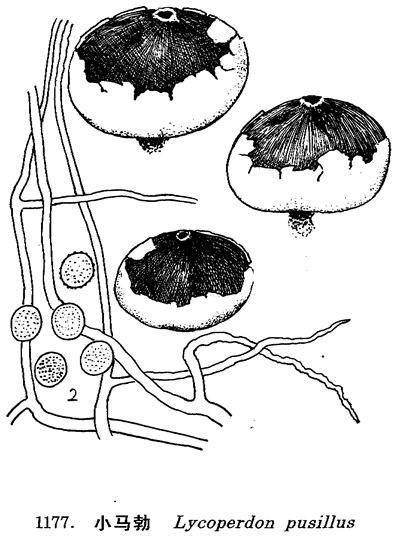 图 1177 小马勃 : 1. 子实体, 2. 孢子, 3. 孢丝