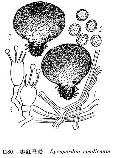 图 1180 枣红马勃 : 1.子实体, 2.孢子, 3.孢丝