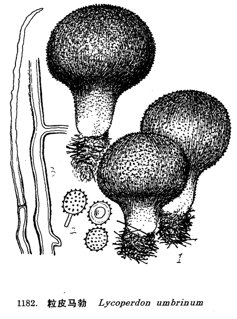 图 1182 粒皮马勃 : 1. 子实体, 2. 孢子, 3. 孢丝