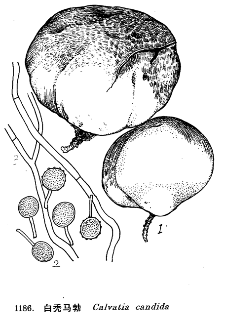 图 1186 白秃马勃 : 1. 子实体, 2. 孢子, 3. 孢丝