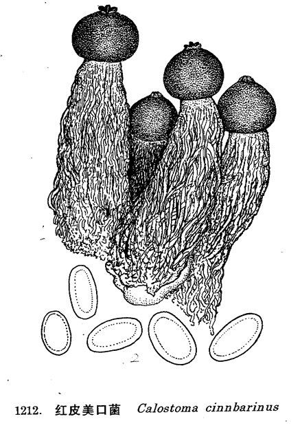 图 1212 红皮美口菌 : 1. 子实体, 2. 孢子