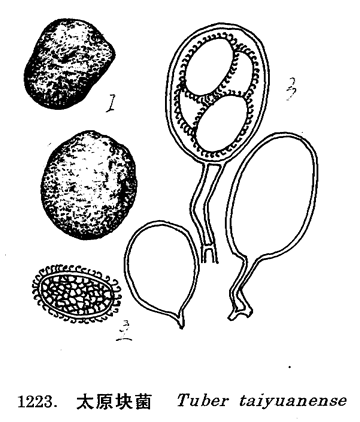 子囊果宽0.7-1.5cm,近球形至块状,早期淡褐色,成熟时变成褐色,光滑,外脉白色,内脉褐色。子囊54.8-75.5μm×47.3-51μm,无色,梨形,袋状椭圆或近球形,有柄,内含2-4(大多为4)个孢子。子囊孢子褐色,28.4-32.1μm×18.9-24.6μm (4个孢子),37.8μm×26.5μm(2孢子),有刺网,刺长3.8-4μm,有钩,网眼直径2.8-4.7μm,壁厚2-2.2μm,2个孢子的子囊较3或4孢子的子囊内的孢子稍大。图例