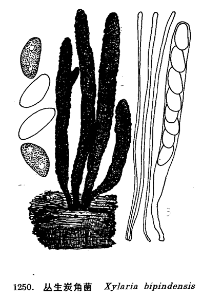 子座一般不分枝,罕分枝呈叉状,圆柱状,高1.8-8cm,粗0.3-0.9cm,表面黑色,稍皱,内部白色,充实近木质。柄短,黑色,长0.4-1cm,子囊壳近球形,埋生于子座内,炭色,表面黑色,孔口稍凸起,有龟裂纹,300-560μm×220-430μm。子囊棒状,有孢子部分为50-70μm×4-6μm,内有孢子8个,单行排列。孢子椭圆形至近纺缍形,稍歪斜,6-10μm×3.5-4μm。图例
