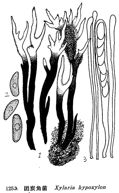 子座一般较小,高3-8cm,不分枝到分枝较多。柱形或扁平,呈鹿角状,污白色至乳白色,后期呈黑色,基部黑色,并有细绒毛。顶部尖或扁平呈鸡冠状。子囊壳黑色,子囊100-150μm×6-8μm。子囊孢子8个,光滑,无隔,11-14μm×5.6μm。图例