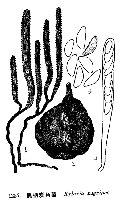 图 1255 黑柄炭角菌 : 1. 子座, 2. 菌核,3. 孢子, 4. 子囊