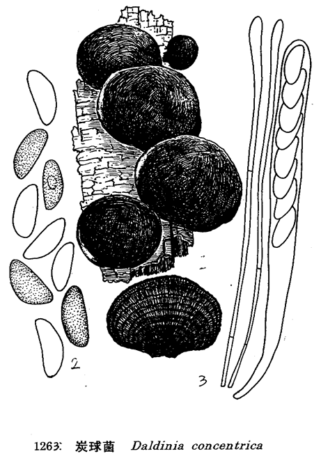 图 1263 炭球菌 : 1. 子座, 2. 孢子, 3. 子囊
