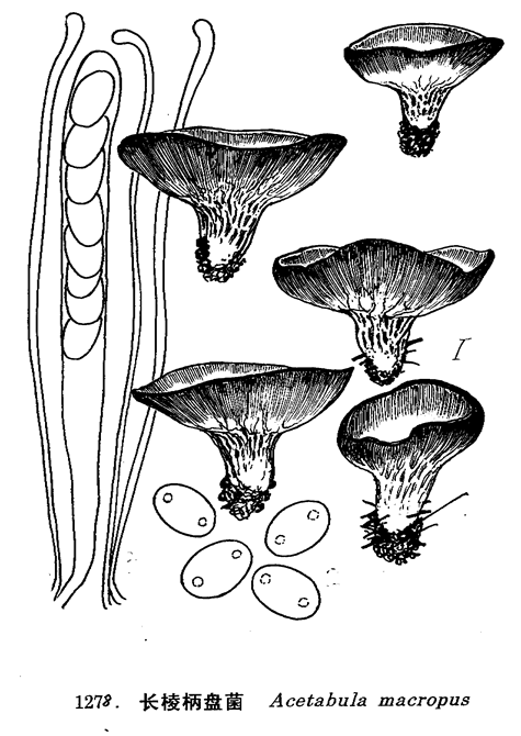 图 1278 短棱柄盘菌 : 1. 子囊盘, 2. 孢子, 3. 子囊及侧丝