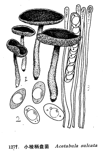 子囊盘小。子囊盘呈盘状或浅杯状,直径2-3cm,常呈不规则卷曲,或边缘内卷稍呈波状。子实层面暗灰色,外侧灰色或浅褐色,并有粉末状物,边缘色深而靠近柄部渐浅至白色。菌柄与子囊盘无明显的沟槽和条棱。子囊近圆柱形,280-320μm×15-17.5μm,含8个孢子单行排列。孢子宽椭圆形或近卵圆形,无色,光滑,15-20μm×12-13.5μm,含油滴。侧丝细长,淡黄色,项部膨大,稍弯曲,直径6-7μm。图例