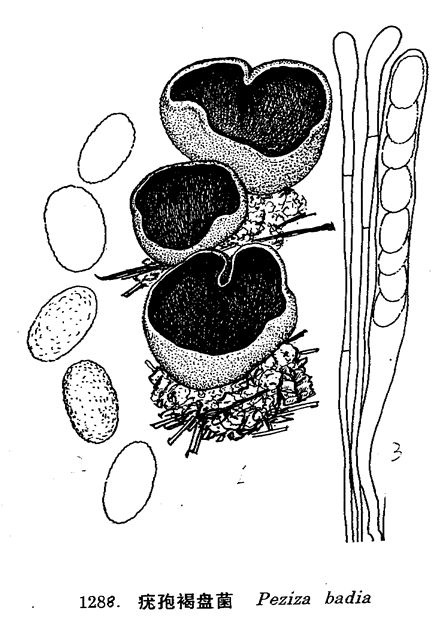 图 1288 疣孢褐盘菌 : 1. 子囊盘, 2. 孢子, 3. 子囊及侧丝