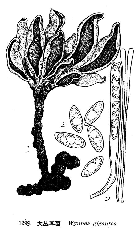 子囊盘中等至大型,自地下菌核上发生,有一共同的菌柄,有的有分枝,从柄上成丛长出几个到十多个兔耳状的子囊盘,高达10-15cm。子囊盘紫褐色至褐色,高3-8cm,宽1-3cm,两侧向内稍卷,子实层红褐色,平滑,外部色较浅亦皱缩。菌柄3-7cm,粗1-2cm,黑褐色有皱。子囊圆柱形,400-500μm×14-18μm ,内含8个单行排列的孢子。孢子长椭圆形至肾脏形,22-38μm×12-15μm。侧丝细长,顶部稍粗达4-5μm。图例
