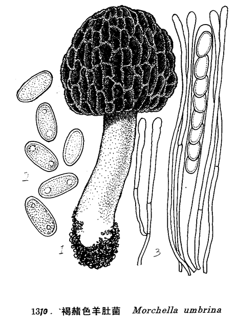 子囊果较小。高5-8cm,菌盖高2-4.5cm,宽2-4cm, 近球形或头状或近卵圆形,黑灰色至黑褐色,顶部平或凹,脉棱多纵向排列又有小横脉相连,凹窝深,边缘与菌柄连接。菌柄长2-4cm,粗0.5-1cm,近白色,有时带赭色,表面近光滑,基部膨大,空心。菌肉污白色或带褐色。子囊圆柱形,含8个孢子,325-380μm×16.9-23μm。侧丝线形,顶部稍膨大,可达20μm,有分隔及分枝。孢子无色,光滑,椭圆形,18-23μm×8.5-12μm。图例