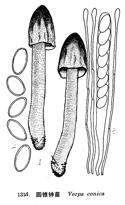 子囊果小。高5-9.5cm。菌盖呈圆锥形或近钟形,高1-3cm,直径1-2cm,暗褐色或褐色至浅褐色,表面近平滑或稍有凹窝,近顶部下与柄着生,边缘与柄分离。菌肉薄,近无色。柄近圆柱形,有时稍弯曲,长4-7cm,粗0.5-1.5cm,污白色,表面近平滑或有细小疣,内部空心。孢子近椭圆形,几无色,光滑,20-26μm×12-15μm。子囊300-350μm×21-23μm,含8枚孢子。侧丝有分隔, 顶部膨大。图例