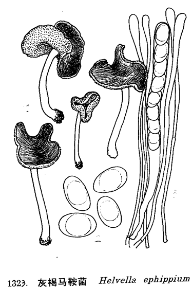 子囊果小。菌盖近马鞍形或呈不规则的马鞍形,直径0.6-1cm,灰色至灰褐色,有的近黄褐色,表面平坦。下表面色浅,近灰白色,粗糙呈粉粒状,边缘与柄分离。菌柄圆柱形,长2-4cm,粗0.2-0.3cm,平滑或有的具浅沟凹,表面粗糙呈粉粒状,内部实心。子囊圆柱形,含子8枚,单行排列,230-280μm×13- 18μm。孢子无色,椭圆形,平滑。18-21μm×11-12.5μm,含一大油滴。侧丝细长呈线形,不分枝,无或有隔,顶端膨大,粗5-8μm。图例