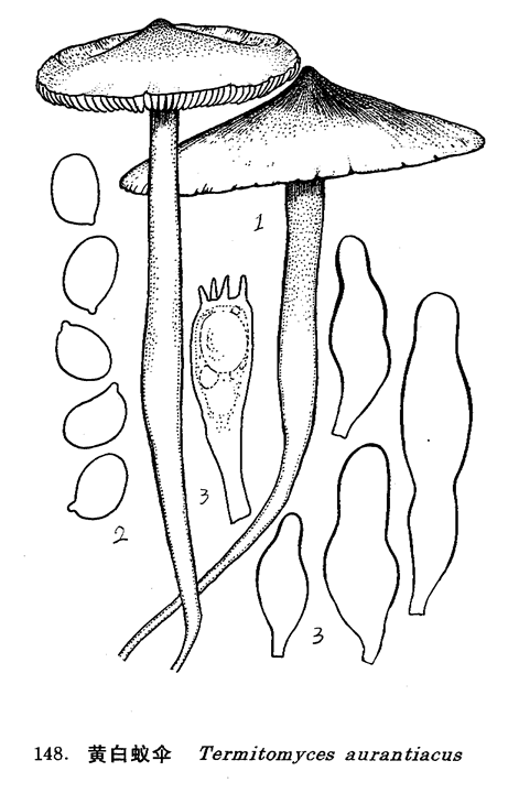 子实体中等至较大。菌盖直径5-10cm或更大,幼时圆锥形,钟形或斗笠形,后期近平展,中部明显突起,表面土黄色,顶部色深,边缘波状或开裂。菌肉纯白色至污白色。菌褶白色,离生,稍稀,不等长。菌柄细长,圆柱形,光滑,白色,基部稍粗而向下延伸连接蚁巢,内部实心,纤维质。孢子印奶油色。孢子卵圆或宽椭圆形,无色,光滑,5.6-7.5μm×3.8-5μm。 囊体近纺锤-形,顶部钝圆或稍尖,厚壁。图例