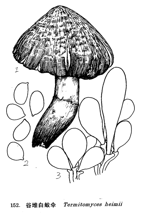 图 152 谷堆白蚁伞 : 1. 子实体, 2. 孢子, 3.褶侧囊体