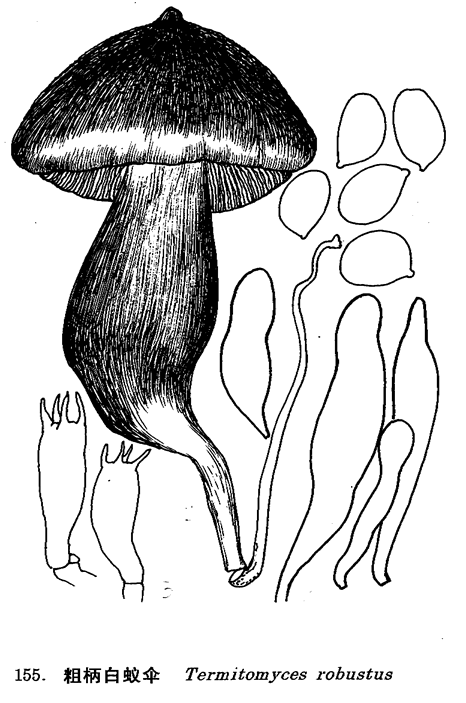 子实体中等至较大。菌盖直径8-20cm,初期圆锥形,后伸展,中部凸起,表面粗糙至近光滑,中部茶褐色,周围呈赭褐色或淡褐色,老时边缘有撕裂。菌肉白色。菌褶离生,白色至乳黄色,密,不等长,菌柄粗壮,靠地面部位明显膨大,长5-10cm,粗1-3.5cm,膨大处可达4cm。基部向下延伸呈假根,其长短与白蚁巢位置深浅有关。担子19-25μm×7-8μm。孢子印乳黄色。孢子无色,光滑,椭圆、卵圆至宽卵圆形,5-7.6μm×4-4.5μm。褶侧囊体和褶缘囊体多呈棍棒状,至纺锤状,24-45(60)μm×10.2-20μm。图例