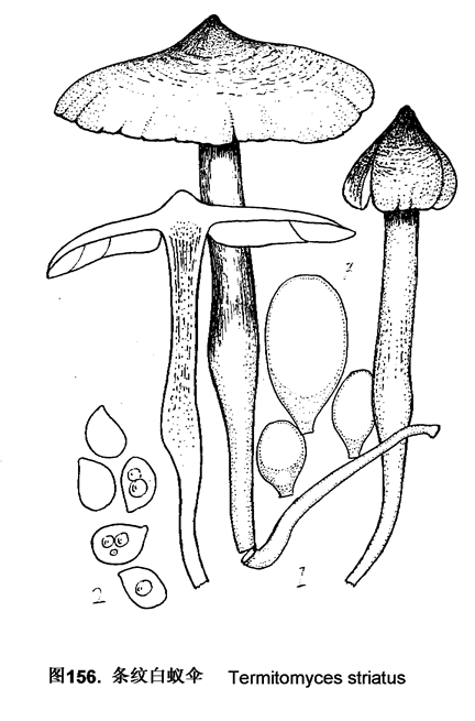 图 156 皱纹白蚁伞 : 1. 子实体, 2. 孢子, 3. 褶缘和褶侧囊体