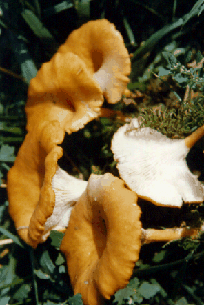 子实体较小。菌盖直径5-8cm,扁半球形至扁平,后中部下凹呈漏斗状,表面干,光亮,浅土红至浅粉褐色。有时橘黄色,湿润时色彩鲜艳,菌褶延生,密,白色至污白色,不等长。菌柄细长,圆柱形,长4-8cm,粗0.4-1cm,光滑,同盖色或较盖色浅,内部松软。孢子印白色。孢子无色,光滑,椭圆形,5-8μm×3.5-5μm。