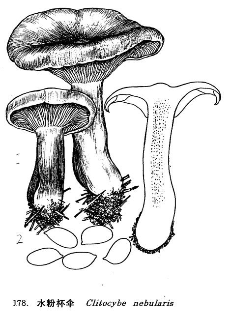 子实体较大。菌盖4-13cm。常常颜色多变化,呈现为灰褐、烟灰色至近淡黄色,干时稍变白。菌盖边缘平滑无条棱,但有时成波浪状或近似花瓣状。菌褶窄而密,污白色,稍延生。菌柄长5-9cm,粗达3cm,表面白色,基部往往膨大。孢子印白色。孢子光滑、无色,椭圆形,5.5-7.5μm×3.5-4μm。