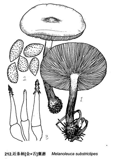 子实体较小,白色。菌盖直径2-7cm,扁球形,后期扁半球形或扁平,往往边缘拱起,中央有一凸起,表面光滑,初期白色,后期变乳黄褐色,中部色深。菌肉白色,中部稍厚,具香气味。菌褶直生或稍变生,白色,乳白色或带粉色,有时具褐斑。密,不等长。菌柄白色,后期带黄褐色,圆柱形。长3-7cm,粗0.4-0.8cm,基部稍膨大,具长条纹,伤处变粉褐色。内部实心或松软。孢子椭圆形,或卵圆形,无色具麻点,8-10μm×5-6.5μm。褶侧囊体棱形,顶端有附属物,中部往往有隔膜,3.5-4.5μm×5-6.5μm。图例