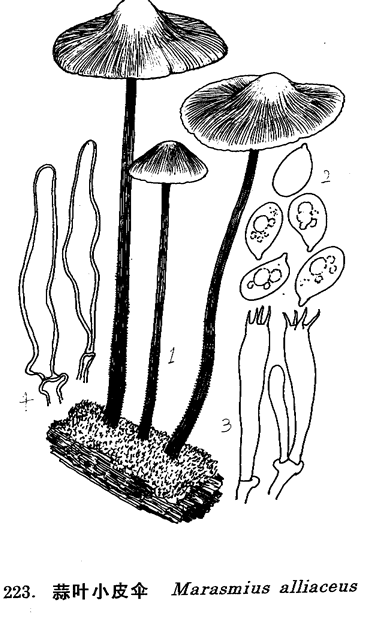 图 223 蒜叶小皮伞 : 1. 子实体, 2. 孢子, 3. 担子,4. 囊体
