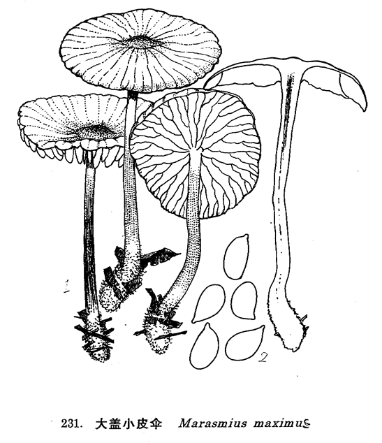 子实体一般中等。菌盖直径3-10cm,初期近钟形、扁半球至近平展,中部凸起或平,浅粉褐色、淡土黄色,中央色深色,干时表面发白色,有明显的放射状沟纹。菌肉白色,薄,似革质。菌褶弯生至近离生,宽,稀,不等长,同盖色。菌柄细,柱形,质韧,表面有纵条纹,上部似有粉末,长5-10cm,粗0.2-0.4cm,内部实心。孢子椭圆形,无色,光滑,7.5-9μm×3-4μm。褶缘囊体近纺缍状或棒状或不规则形。图例