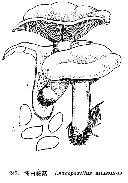 图 243 纯白桩菇 : 1. 子实体,2. 孢子