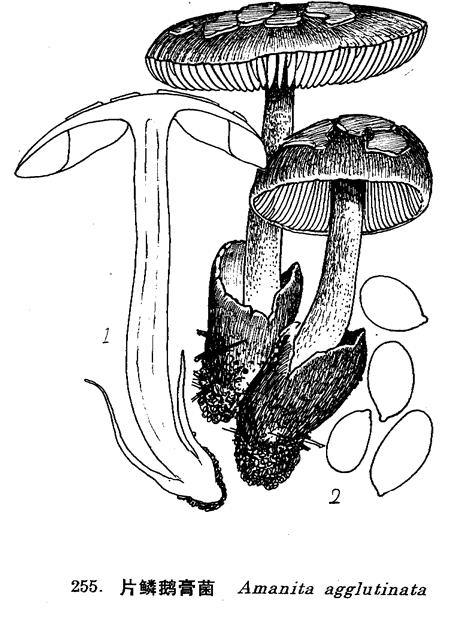 图 255 片鳞鹅膏菌 : 1. 子实体, 2. 孢子