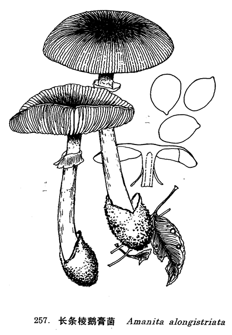 子实体小至中等,2-8cm,幼时近卵圆至近钟形,后期近平展,往往中部低中央稍凸,灰褐色或淡褐色带浅粉红色,边缘有放射状长条棱,菌肉薄,污白色,近表皮处色暗。菌褶污白色至微带粉红色,稍密,离生,不等长,短菌褶似刀切状。菌柄长4-8cm,粗0.4-0.7cm,细长圆柱形,污白色,表面平滑,内部松软至中空。菌环膜质,污白色,生柄上部。菌托苞状,污白色。孢子印白色。孢子卵圆形至近球形,无色,光滑,10.5-14×7.5-9.5cm,非糊性反应。图例