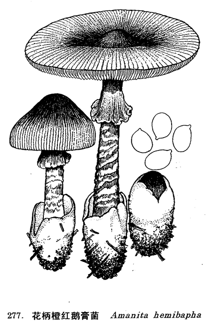 图 277 花柄橙红鹅膏菌 : 1.子实体, 2.孢子