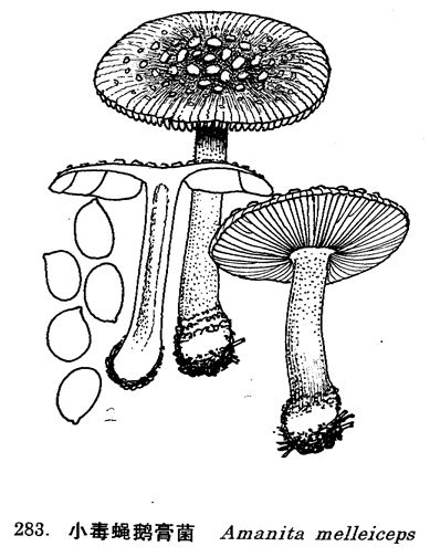 子实体较小,无菌环。菌盖表面浅黄或米黄色或浅土黄色,往往中部颜色较深,菌盖直径2-4cm,初期半球形,后渐平展中部下凹,湿润时粘,边缘具明显的条棱,表面具颗粒状白色鳞片。菌肉白色。菌褶白色,离生,较密,不等长,褶缘有细粉粒。菌柄较短,2-6cm,粗0.5-0.8cm,内部松软至实心,质脆易断,上部有粉粒,基部膨大并有不很明显的环带状菌托。孢子印白色。孢子无色,椭圆形至宽椭圆形,光滑,内含一大油滴,(8.3)10-12.5(16)μm×(6.3)7.5-8.8(12.5)μm,非糊性反应。图例