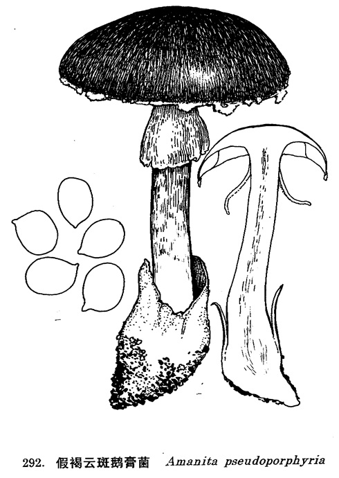 子实体中等至稍大。菌盖幼时半球形,后渐扁平或近平展,直径4-12cm,褐灰色,中部色深,光滑,似有隐生纤毛及形成花纹,稍粘,有时表面附有菌托碎片。菌盖边缘平滑无条棱,常附有白色絮状菌幕残物。菌肉白色,中部稍厚。菌褶纯白色,密,离生,不等长,边沿似有粉粒。菌柄近柱形,纯白色,长5-12cm,粗0.6-1.8cm,常有纤毛状鳞片或有白色絮状物,基部膨大向下稍延伸根状,内部实心。菌环白色膜质,生柄之上部。菌托苞状或袋状,白色,有时边缘破碎。孢子印白色。孢子卵圆形至宽椭圆形,7.5-9μm×4-6μm,糊性反应。图例