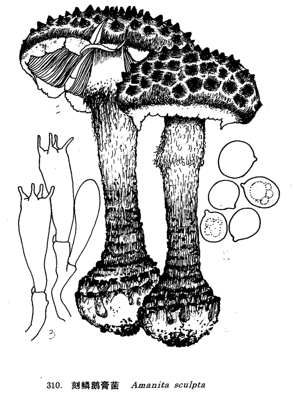 图 310: 刻磷鹅膏菌 1.子实体, 2.孢子, 3. 担子