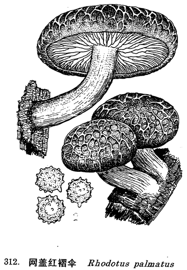 子实体小或中等大,粉红色或粉肉色。菌盖直径5-10(13)cm,半球形至扁球形,后期近平展,中部稍下凹,边缘内卷,表面平滑,幼时盖表面或盖缘具有浅色网棱。菌肉近白或带粉红色,稍厚,气味香。菌褶粉红至粉黄色,直生,稍宽,较密,不等长。菌柄较短,等粗近柱形,长3-7cm,粗0.5-1.5cm,较盖色浅,有条纹,纤维质,内部实心。无菌环。孢子印粉红色。孢子带粉红色,近球形,粗糙有小疣,5-8μm×4.5-7.5μm。图例