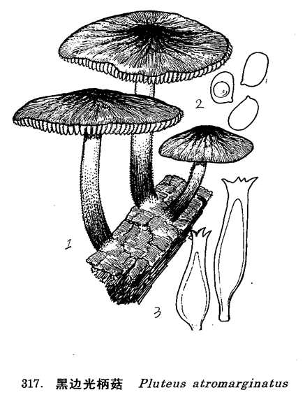 图 317 黑边光柄菇 : 1. 子实体, 2. 孢子, 3. 褶侧和褶缘囊体