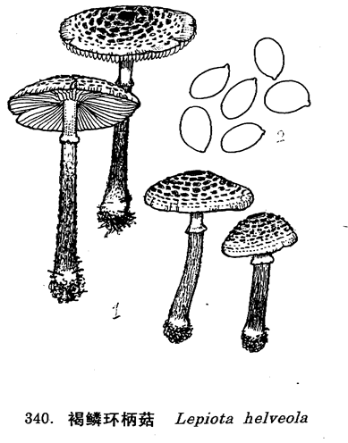 子实体小。菌盖表面有褐色小鳞片,具菌环且无菌托。菌盖初期扁半球形,开伞后平展,中部稍凸起,直径1-4cm左右。表面密被红褐色或褐色小鳞片,尤其中部较多,往往呈环带状排列。菌肉白色。菌褶白色或带污黄,离生,较密,不等长。菌柄细弱,长2-6cm,粗0.3-0.7cm,白色稍带粉红色,内部空心,基部稍膨大。菌环白色,小而易脱落,生柄之上部。孢子印白色。孢子无色,光滑,椭圆形,5-9μm×3.5-5μm。图例