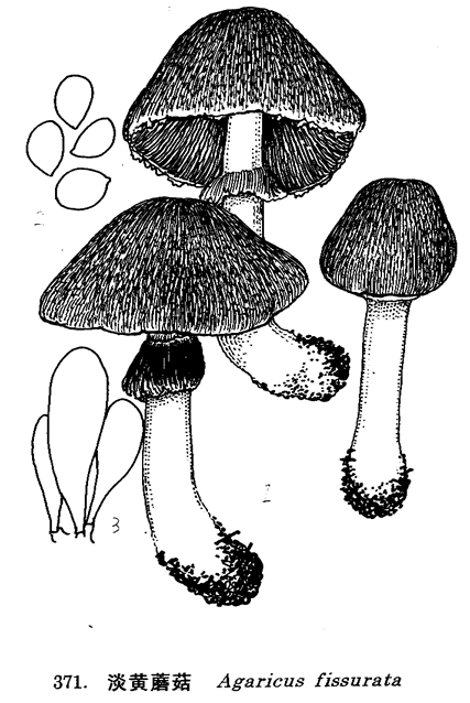 图 371 淡黄蘑菇 : 1. 子实体, 2. 孢子, 3. 褶缘囊体