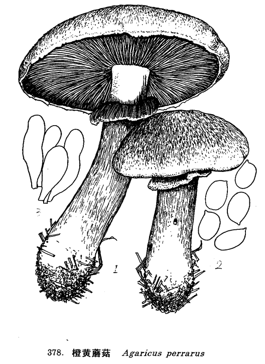 子实体较大。菌盖直径5-17cm,初半球形后渐平展,有黄褐色密集的丛毛状鳞片,边缘逐渐变浅而呈现橙黄色。菌肉白色,伤变暗黄色。菌褶后期黑褐色,两端渐尖、密、离生、不等长。菌柄长8-13厘米,粗2.5-3.5厘米,菌环以上污白色,菌环以下有纤毛状鳞片,棒状,内部松软,基部略膨大,伤变暗黄色。菌环生柄上部,宽大,薄、膜质、易消失。孢子印黑褐色。孢子褐色,椭圆形到广椭圆形,光滑,7-8.5(9.5)μm×5.5-6(6.5)μm,褶缘囊体多样。图例