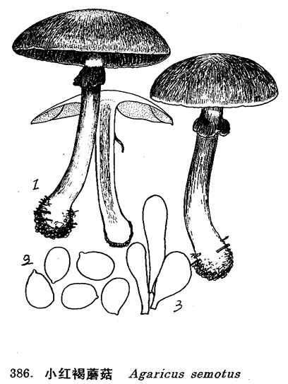 子实体小。菌盖初期近卵圆形,后渐平展呈扁平球形,幼时白色后很快具紫红褐色小鳞片,中部鳞片多,向边缘带黄色至带褐色,直径2-5cm,边沿表面延伸。菌肉白色,稍厚,近基部带黄色。菌褶初期很淡或粉色,渐变灰褐色,离生,不等长。菌柄细长,长3-6cm,粗0.4-0.8cm,白色而基部带黄色且膨大。菌环膜质,生柄的上部。孢子印褐色。孢子光滑,椭圆形,褐色,4.5-6μm×2.8-3μm,褶缘囊体多,卵圆至宽棒状,12-20μm×4-11μm。图例