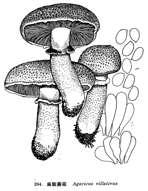 子实体大或较大。菌盖直径10-15cm,初球形,扁半球形,后平展,淡黄色,具平伏的褐色细鳞片,形似麻点。菌肉白色,厚。菌褶初近白色,渐变为粉红色到黑褐色,密,离生,不等长。菌柄长6-8cm,粗1.5-2.5cm,白色,具淡黄色细鳞片,内部松软到中实,基部稍膨大,向上渐细。菌环单层,白色,膜质,较大而厚,生菌柄中部至上部,不易脱落。孢子印深褐色。孢子褐色、光滑,广椭圆形到椭圆形,7-9μm×5.5-6μm。褶缘囊体黄色,棒状,丛生到栅栏状排列,22-31.6μm×8-9.5μm。图例