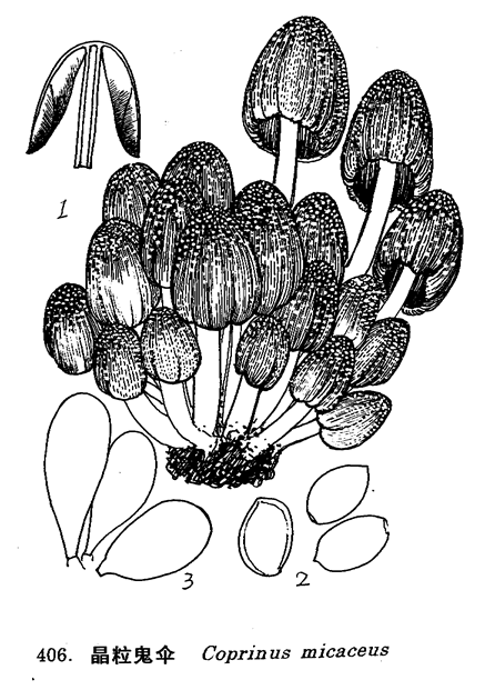 图 406 晶粒鬼伞 : 1. 子实体, 2. 孢子, 3. 褶侧和褶缘囊体