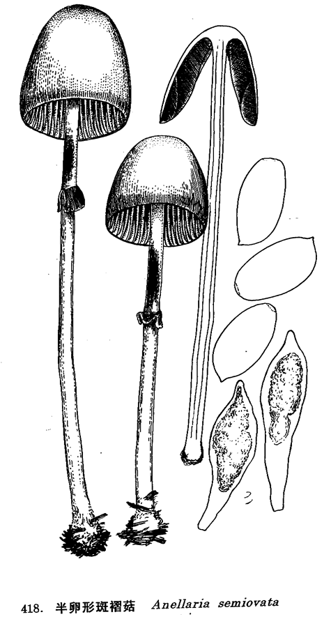 图 418 半卵形斑褶菇 : 1. 子实体, 2. 孢子, 3. 褶侧囊体