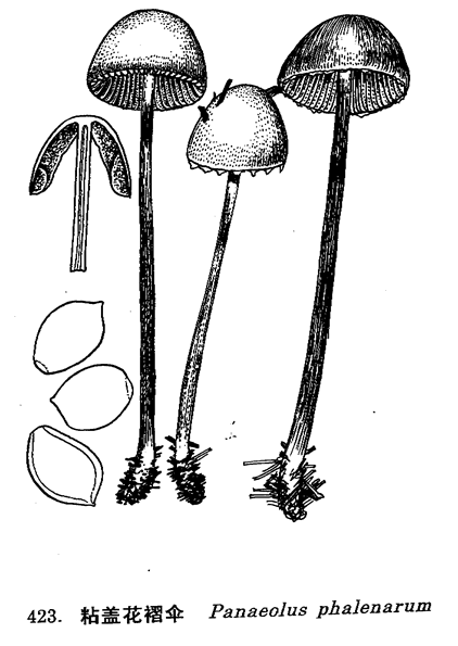 图 423 粘盖花褶伞 : 1. 子实体, 2. 孢子