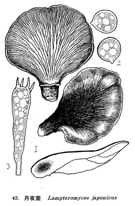 图 43 月夜菌 : 1. 子实体, 2. 孢子, 3. 担子