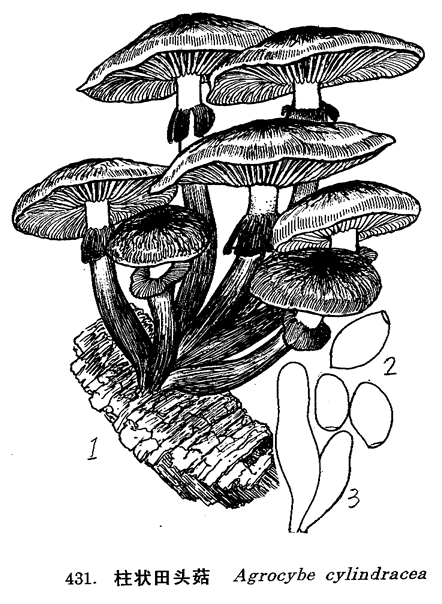 图 431 柱状田头菇 : 1.子实体, 2.孢子, 3. 褶缘,褶侧囊体
