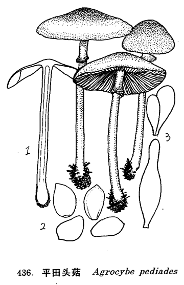 图 436 平田头菇 : 1. 子实体, 2. 孢子, 3. 褶缘和褶侧囊体
