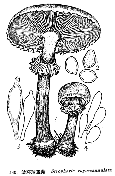 图 440 皱环球盖菇 : 1. 子实体, 2. 孢子, 3. 囊体