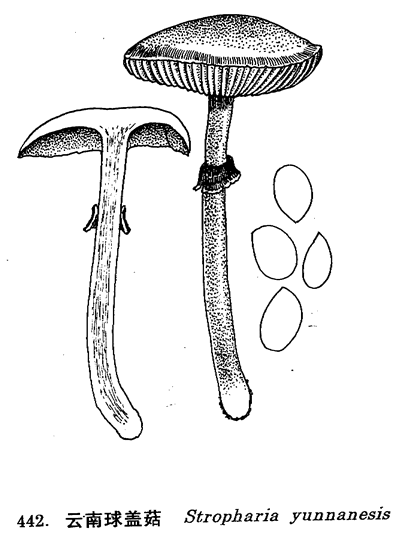 图 442 云南球盖菇 : 1. 子实体, 2. 孢子